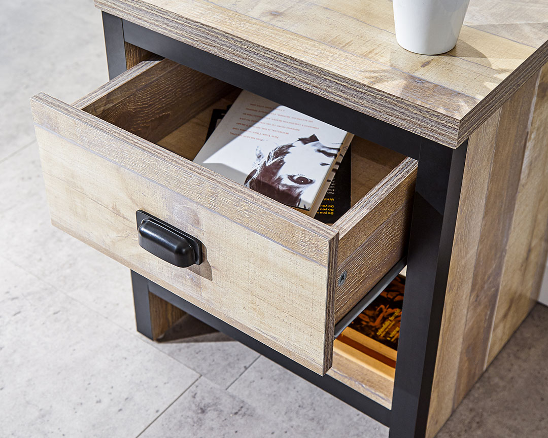 If you’re looking for a contemporary addition to your living space, this industrial-inspired lamp table is the savvy choice. Designed to bring a splash of urban chic into your home, it impresses with its chunky construction and distressed finish in oak or grey. The simple, double-sided design means it can be placed anywhere in the room; use it as an occasional drinks table or pair it with a smart lamp. Complete with deep drawer that has a matching wood-effect interior and 30mm thick top panel plus deep contrasting wooden casing.